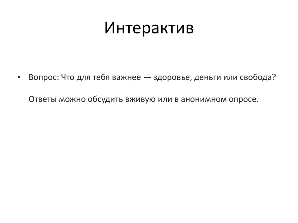 Интерактив• Вопрос: Что для тебя важнее — здоровье, деньги или свобода?