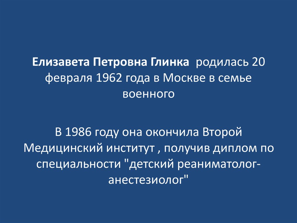 Елизавета Петровна Глинка родилась 20февраля 1962 года в Москве в семье