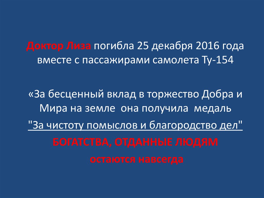 Доктор Лиза погибла 25 декабря 2016 годавместе с пассажирами самолета Ту-154