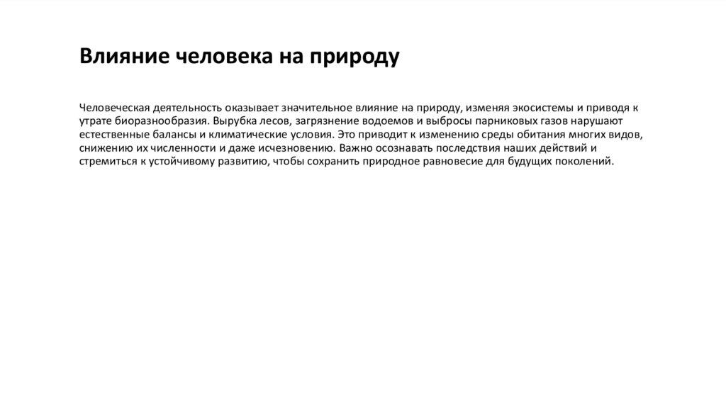 Влияние человека на природуЧеловеческая деятельность оказывает значительное влияние на природу, изменяя экосистемы и приводя к