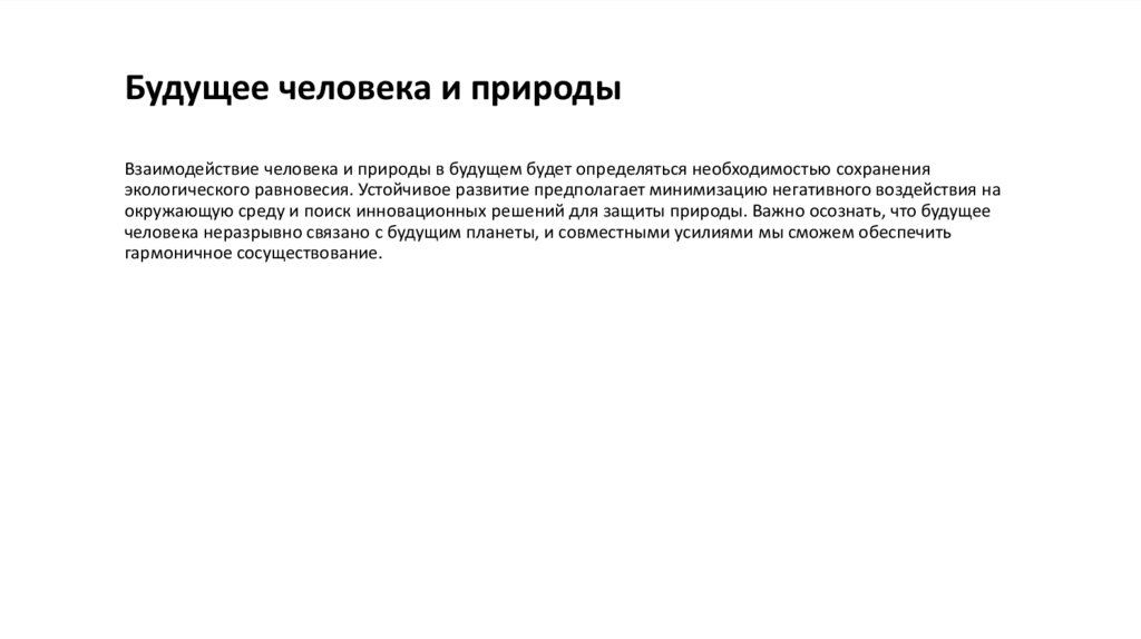 Будущее человека и природыВзаимодействие человека и природы в будущем будет определяться необходимостью сохранения