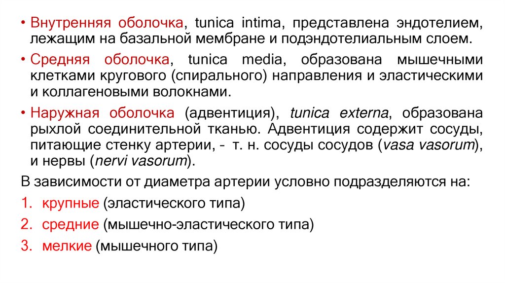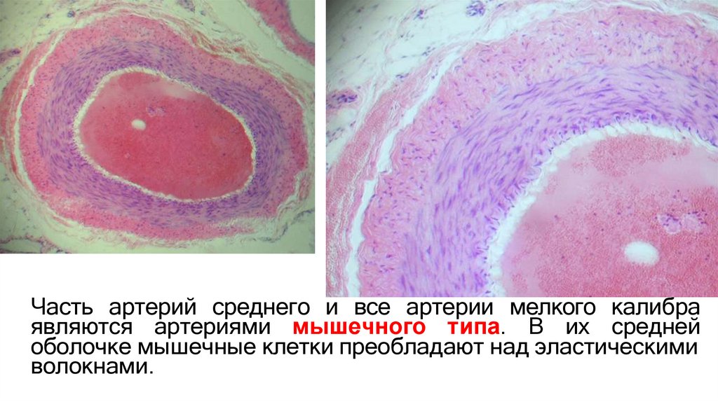 Часть артерий среднего и все артерии мелкого калибраявляются артериями мышечного типа. В их средней