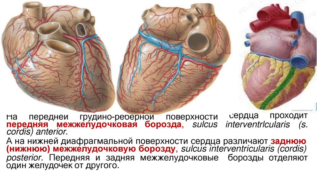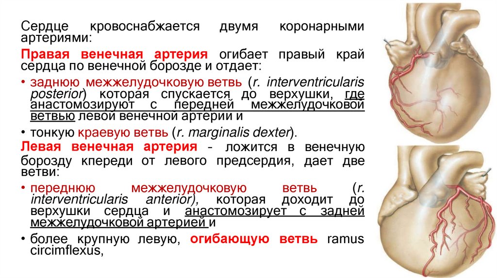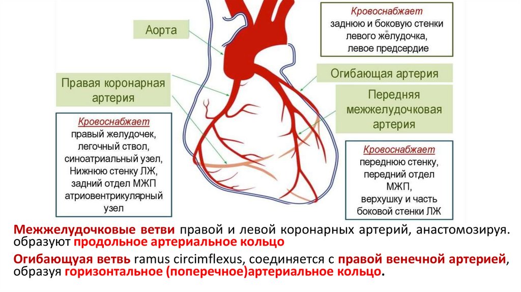 Межжелудочковые ветви правой и левой коронарных артерий, анастомозируя.образуют продольное артериальное кольцо