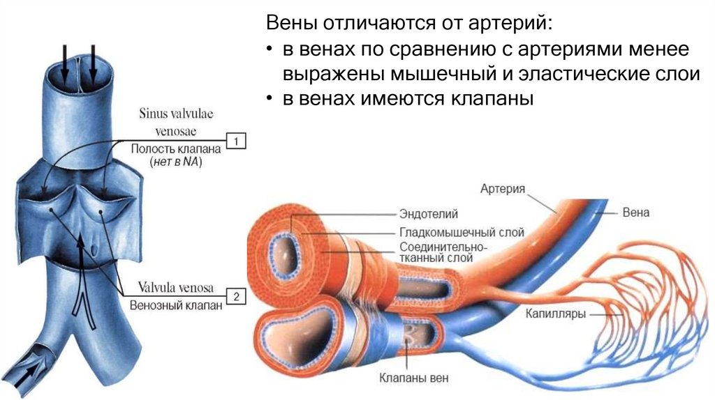 Вены отличаются от артерий:• в венах по сравнению с артериями менее