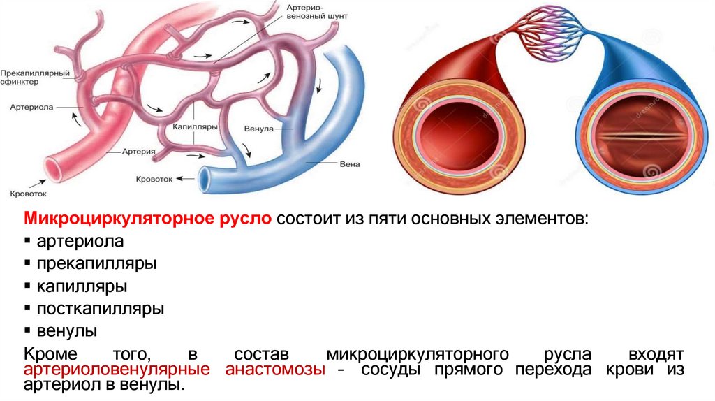 Микроциркуляторное русло состоит из пяти основных элементов:артериола