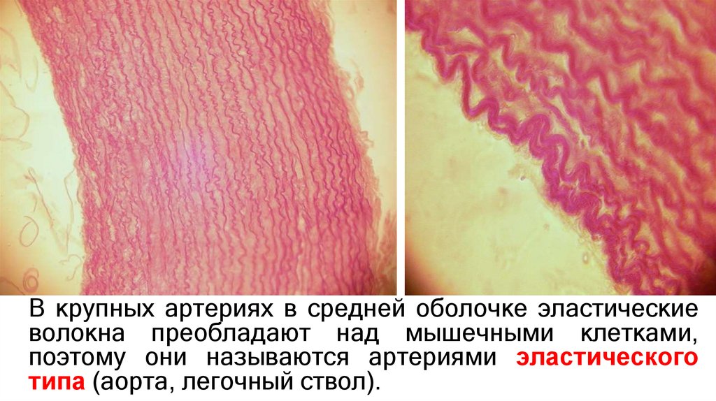 В крупных артериях в средней оболочке эластическиеволокна преобладают над мышечными клетками,