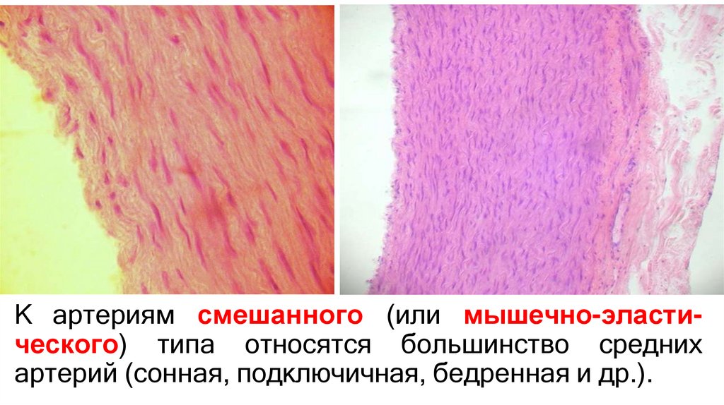 К артериям смешанного (или мышечно-эластического) типа относятся большинство среднихартерий (сонная, подключичная, бедренная и др.).