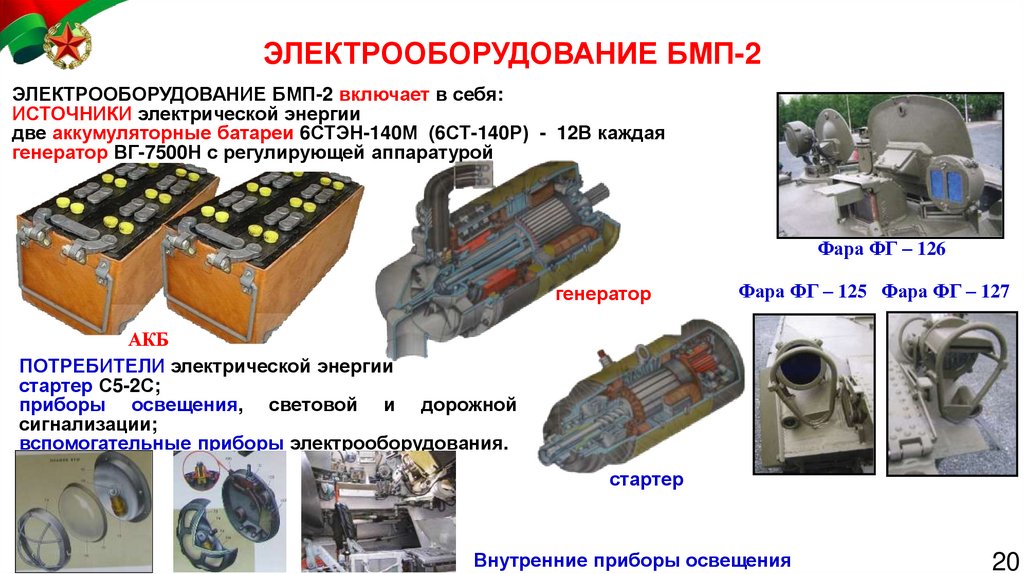 ЭЛЕКТРООБОРУДОВАНИЕ БМП-2ЭЛЕКТРООБОРУДОВАНИЕ БМП-2 включает в себя: