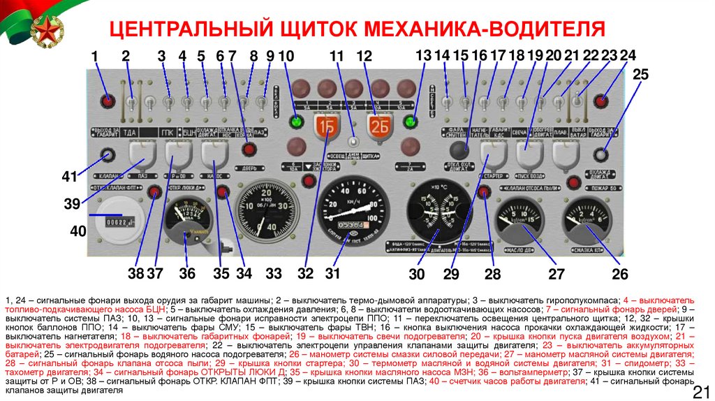 батарей; 25 – сигнальный фонарь водяного насоса подогревателя; 26 – манометр системы смазки силовой передачи; 27 – манометр масляной системы двигателя;