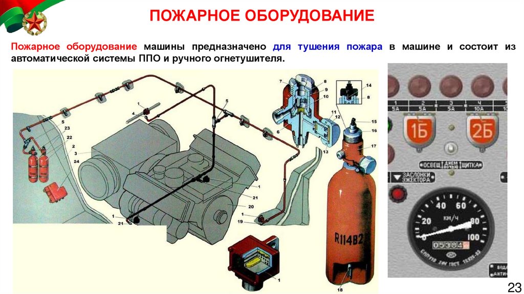 ПОЖАРНОЕ ОБОРУДОВАНИЕПожарное оборудование машины предназначено для тушения пожара в машине и состоит из