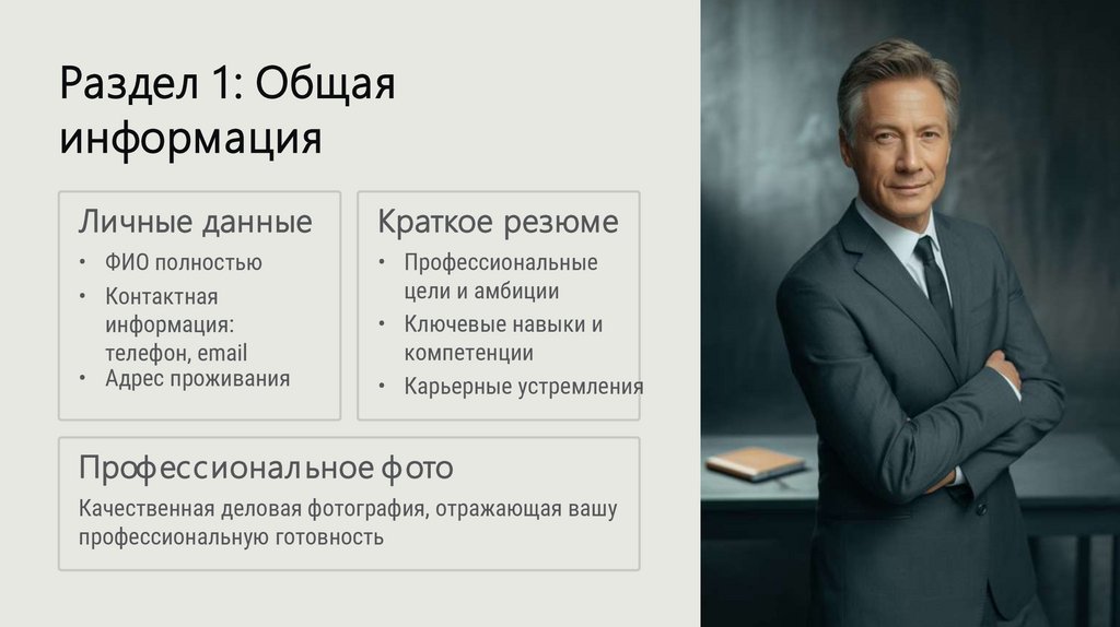 Ключевые элементы включают: личный бренд, профессиональное портфолио, навыки публичных