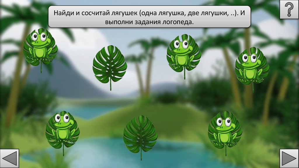 Найди и сосчитай лягушек (одна лягушка, две лягушки, ..). Ивыполни задания логопеда.