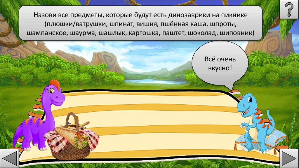 Назови все предметы, которые будут есть динозаврики на пикнике(плюшки/ватрушки, шпинат, вишня, пшённая каша, шпроты,