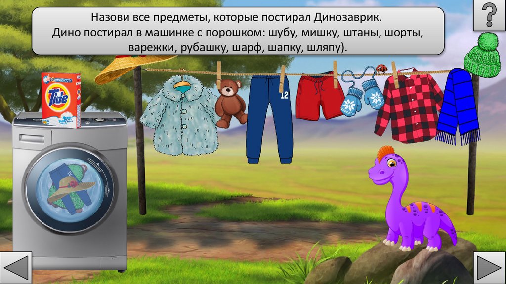 Назови все предметы, которые постирал Динозаврик.Дино постирал в машинке с порошком: шубу, мишку, штаны, шорты,