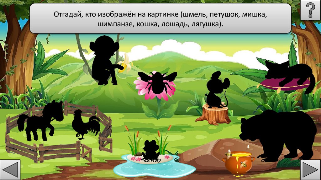 Отгадай, кто изображён на картинке (шмель, петушок, мишка,шимпанзе, кошка, лошадь, лягушка).