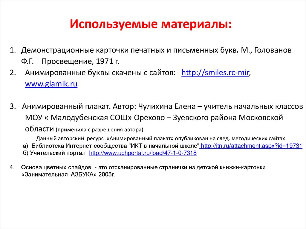 Используемые материалы:1. Демонстрационные карточки печатных и письменных букв. М., Голованов