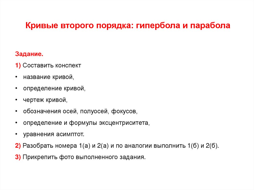Кривые второго порядка: гипербола и параболаЗадание.