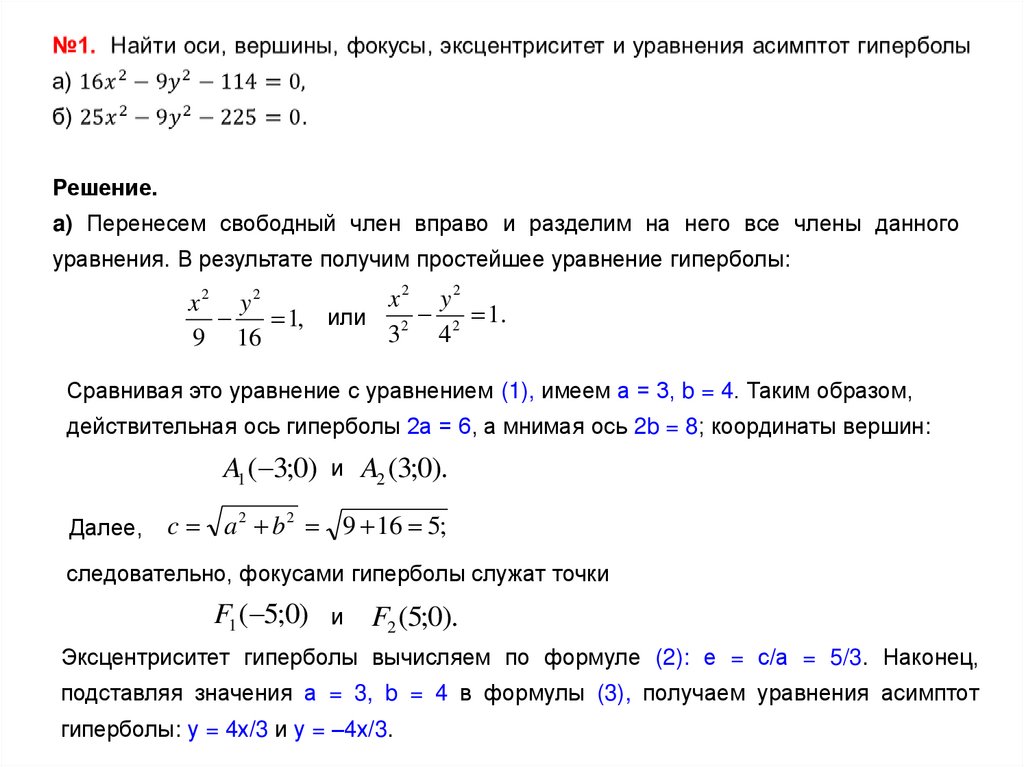 Эксцентриситет гиперболы вычисляем по формуле (2): е = с/а = 5/3. Наконец,