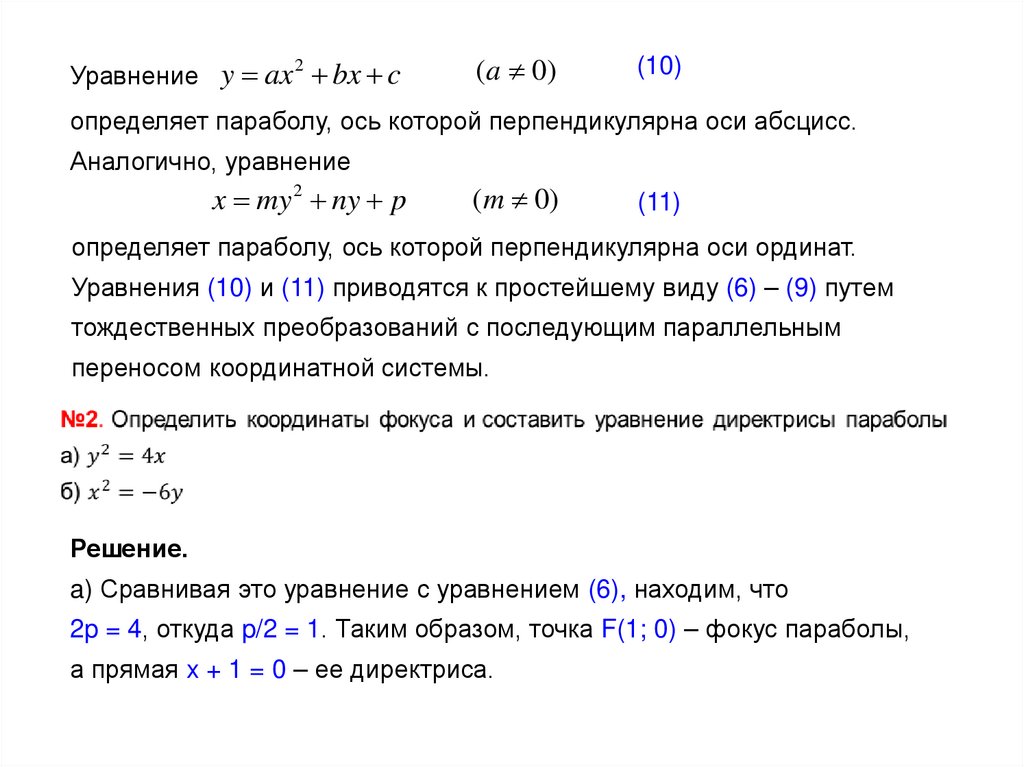 определяет параболу, ось которой перпендикулярна оси ординат.