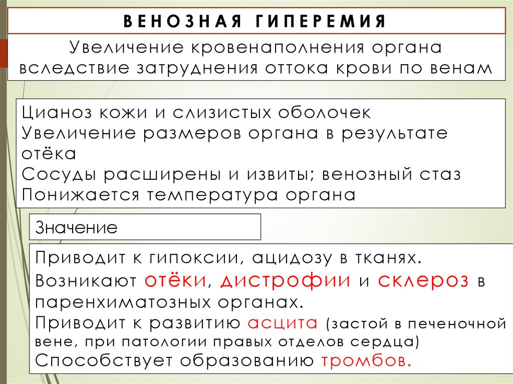 9. Венозная (застойная) гиперемия -увеличение кровенаполнения участка ткани при уменьшении количества оттекающей крови.