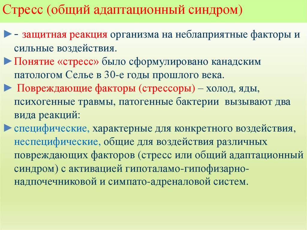 Стресс (общий адаптационный синдром)► - защитная реакция организма на неблаприятные факторы и