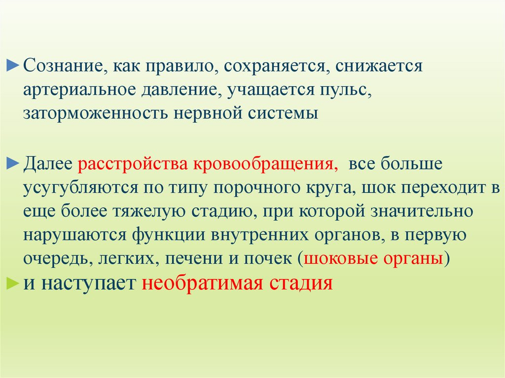 ► Сознание, как правило, сохраняется, снижаетсяартериальное давление, учащается пульс,