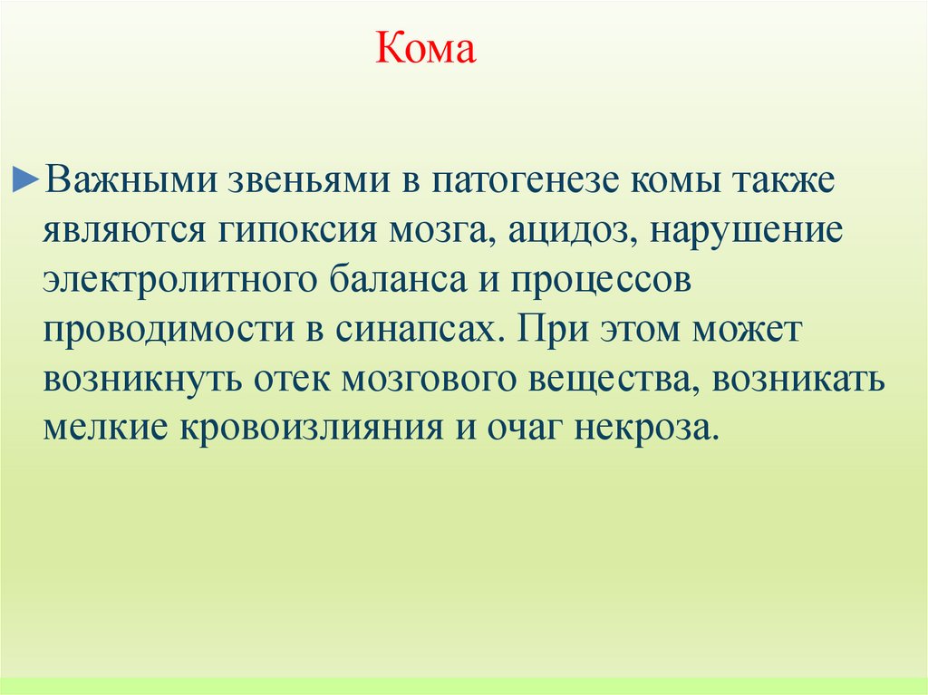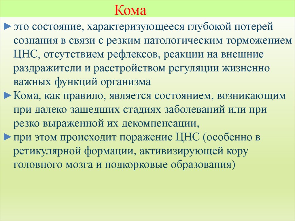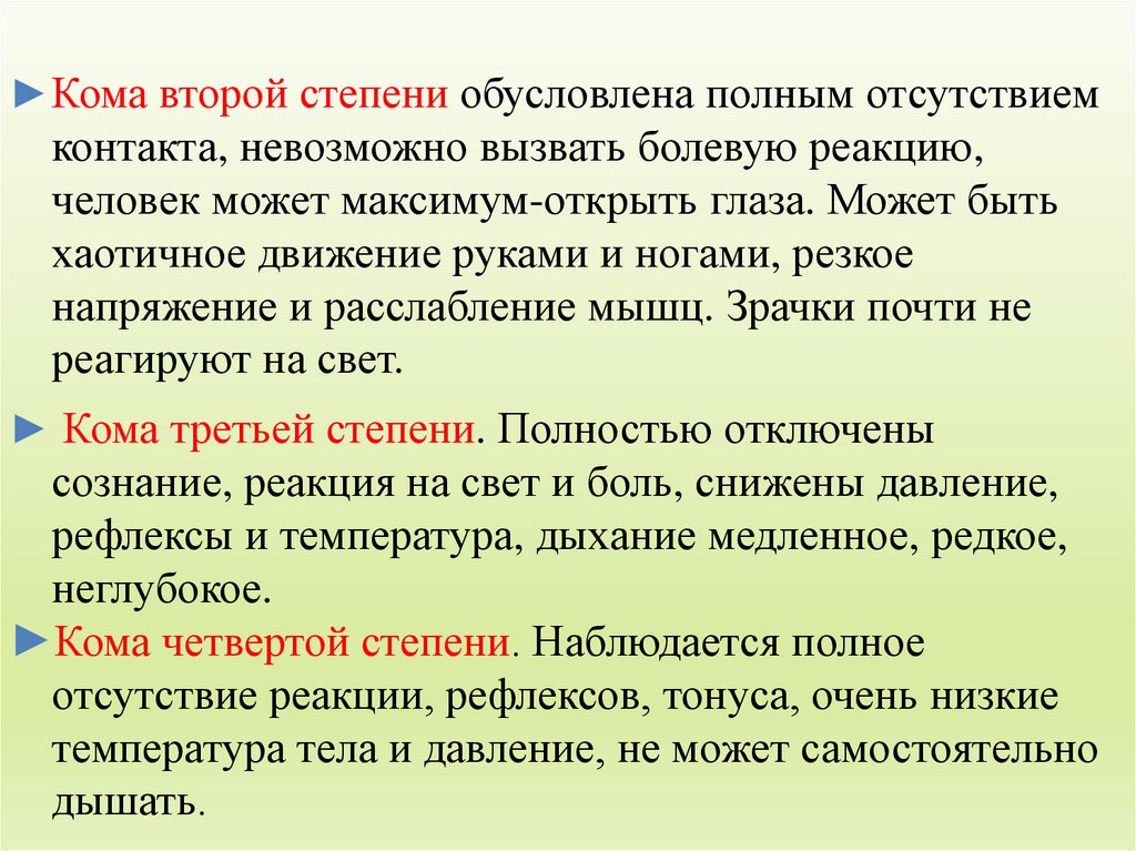 ► Кома второй степени обусловлена полным отсутствиемконтакта, невозможно вызвать болевую реакцию,