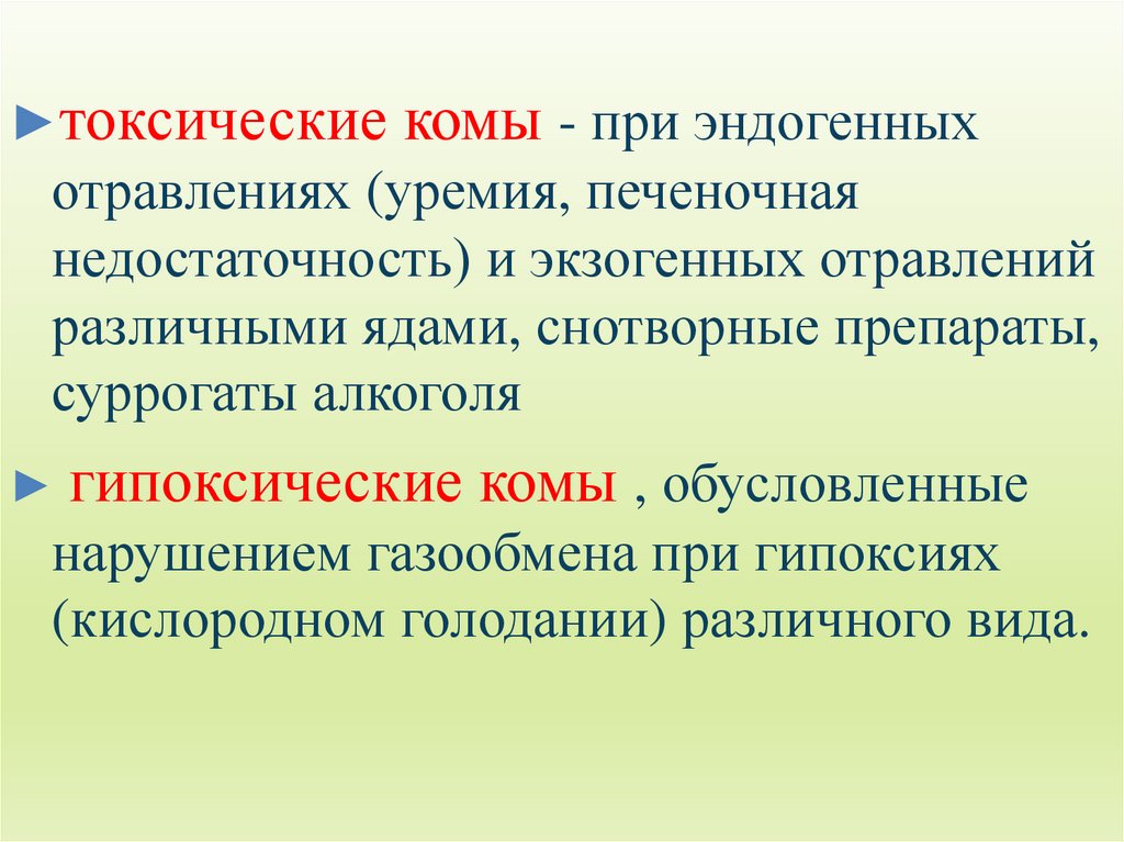 ►токсические комы - при эндогенныхотравлениях (уремия, печеночная