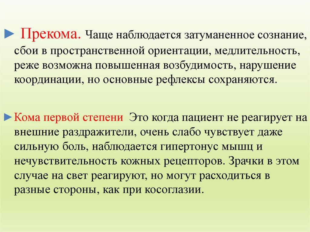 ► Прекома. Чаще наблюдается затуманенное сознание,сбои в пространственной ориентации, медлительность,