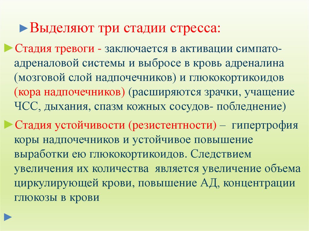 ►Выделяют три стадии стресса:►Стадия тревоги - заключается в активации симпатоадреналовой системы и выбросе в кровь адреналина