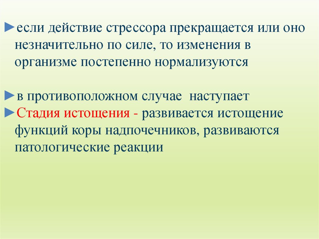 ►если действие стрессора прекращается или ононезначительно по силе, то изменения в