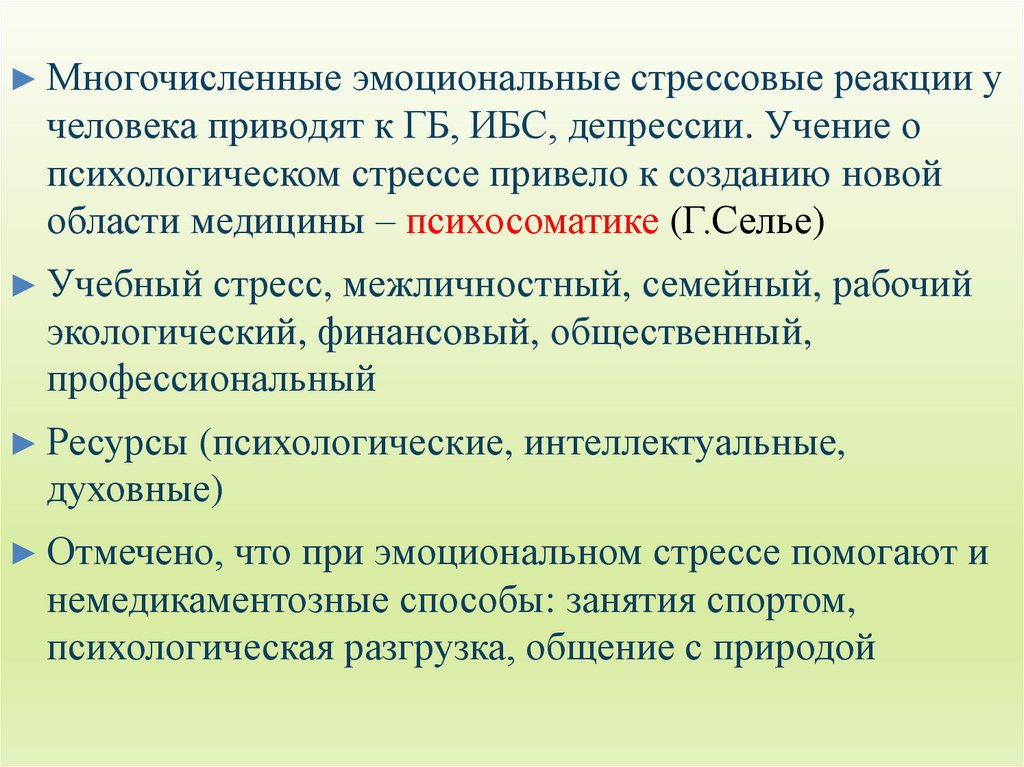 ► Многочисленные эмоциональные стрессовые реакции учеловека приводят к ГБ, ИБС, депрессии. Учение о