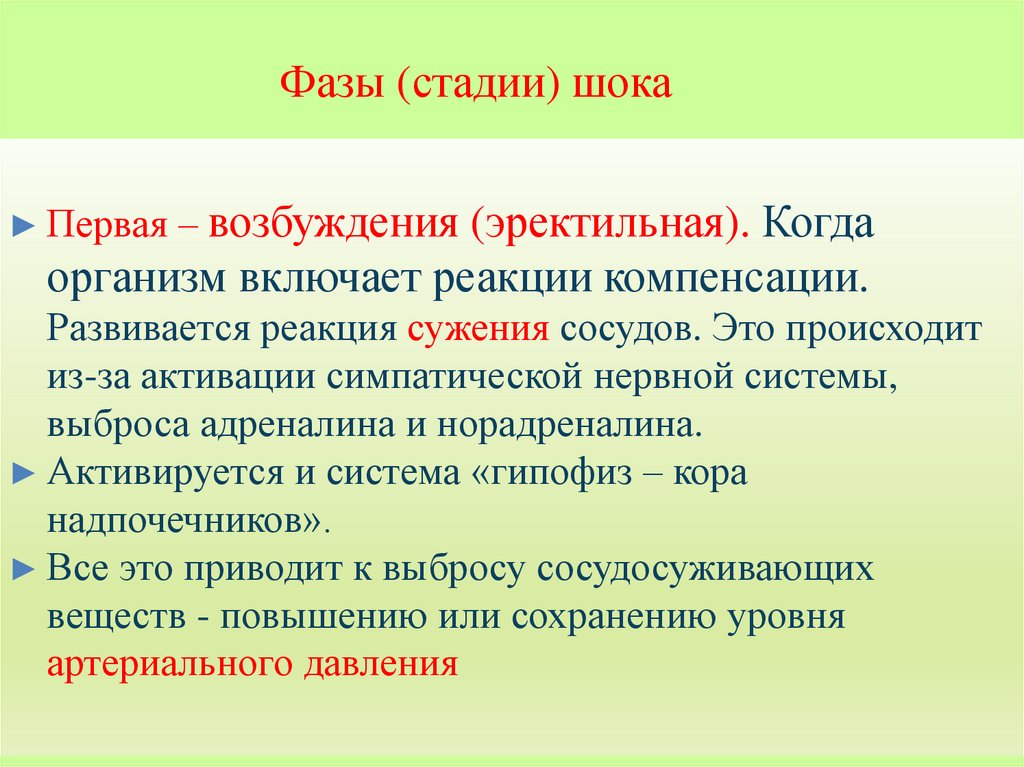 Фазы (стадии) шока► Первая – возбуждения (эректильная). Когда