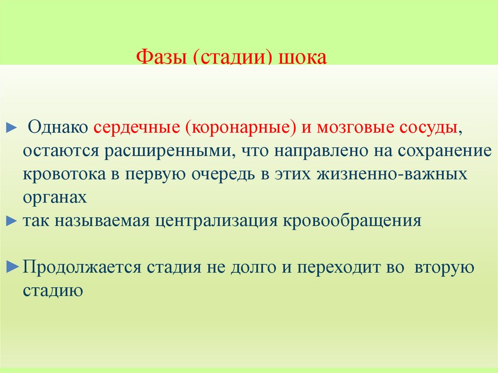 Фазы (стадии) шока► Однако сердечные (коронарные) и мозговые сосуды,
