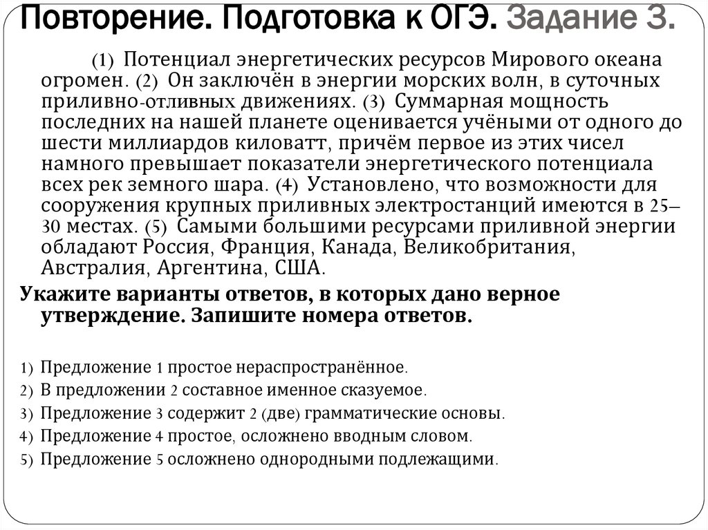 Повторение. Подготовка к ОГЭ. Задание 3.(1) Потенциал энергетических ресурсов Мирового океана