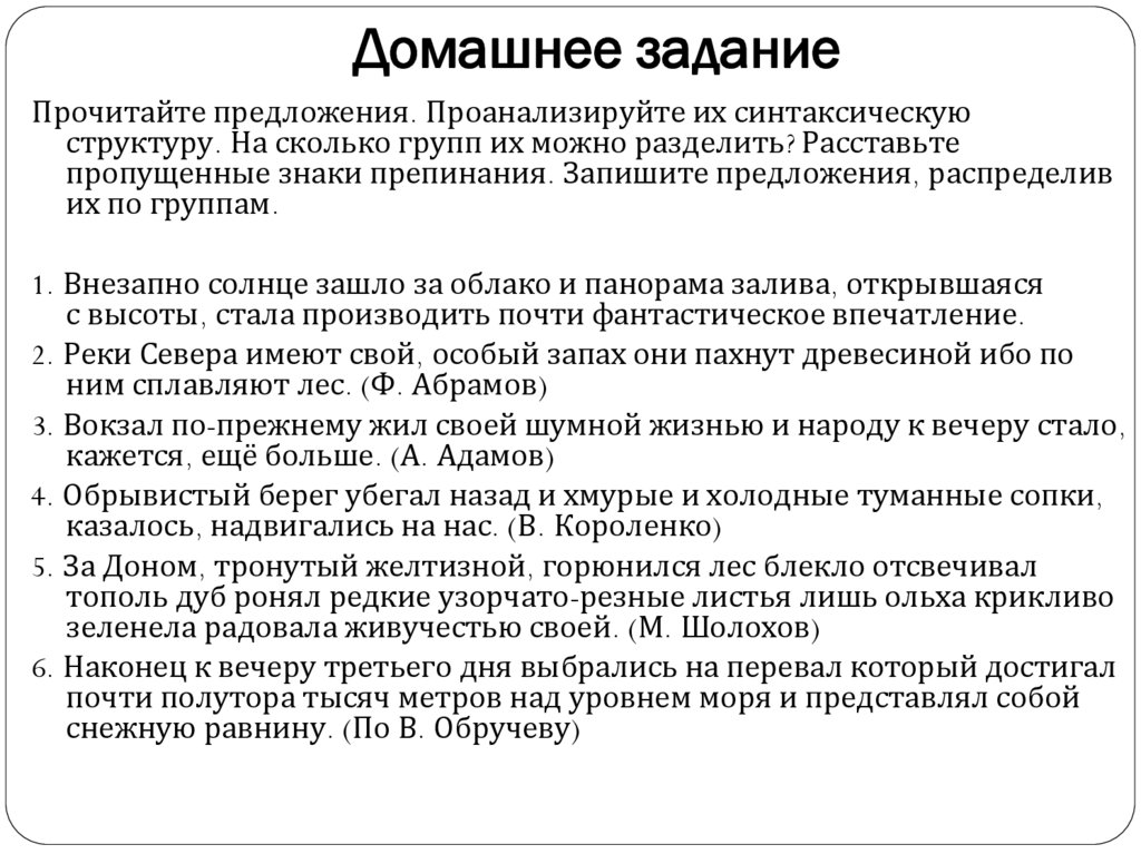 Домашнее заданиеПрочитайте предложения. Проанализируйте их синтаксическую