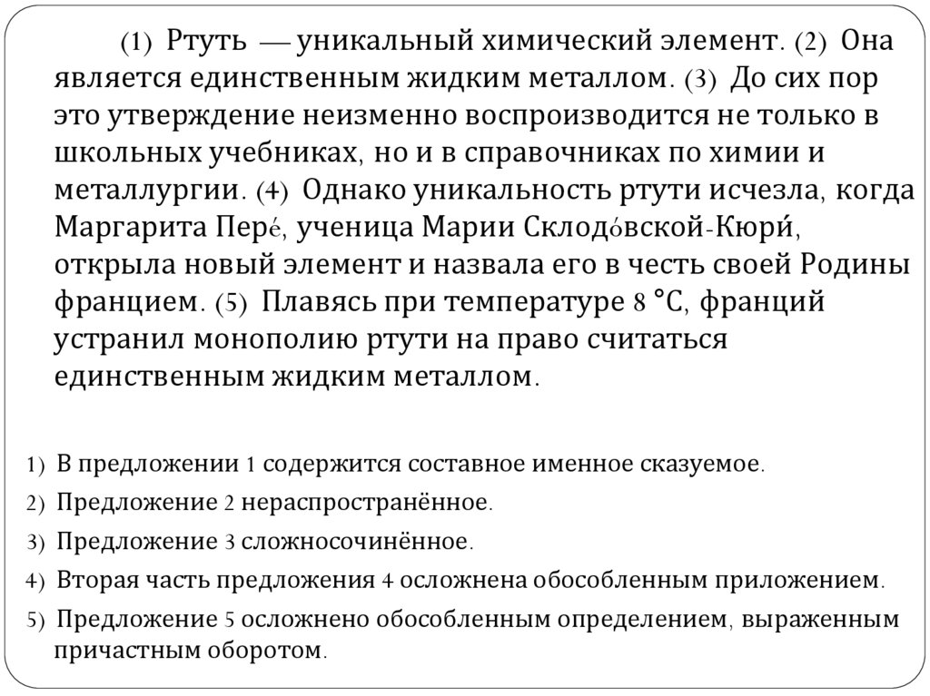 (1) Ртуть — уникальный химический элемент. (2) Онаявляется единственным жидким металлом. (3) До сих пор