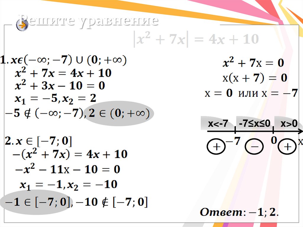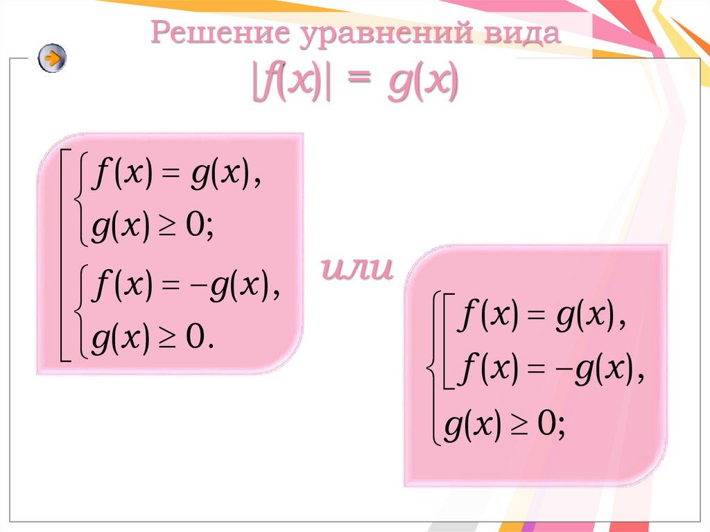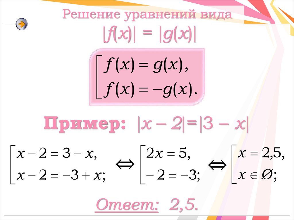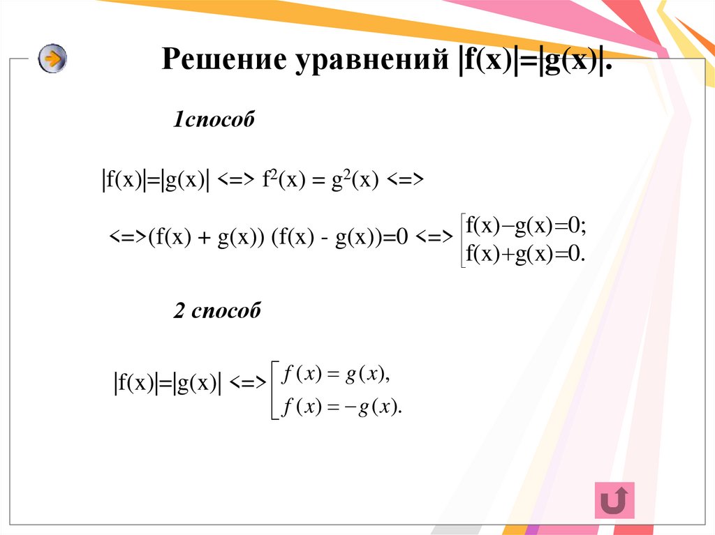 Решение уравнений |f(x)|=|g(x)|.1способ
