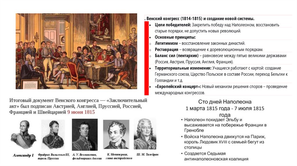 . Венский конгресс (1814-1815) и создание новой системы.Цели победителей: Закрепить победу над Наполеоном, восстановить