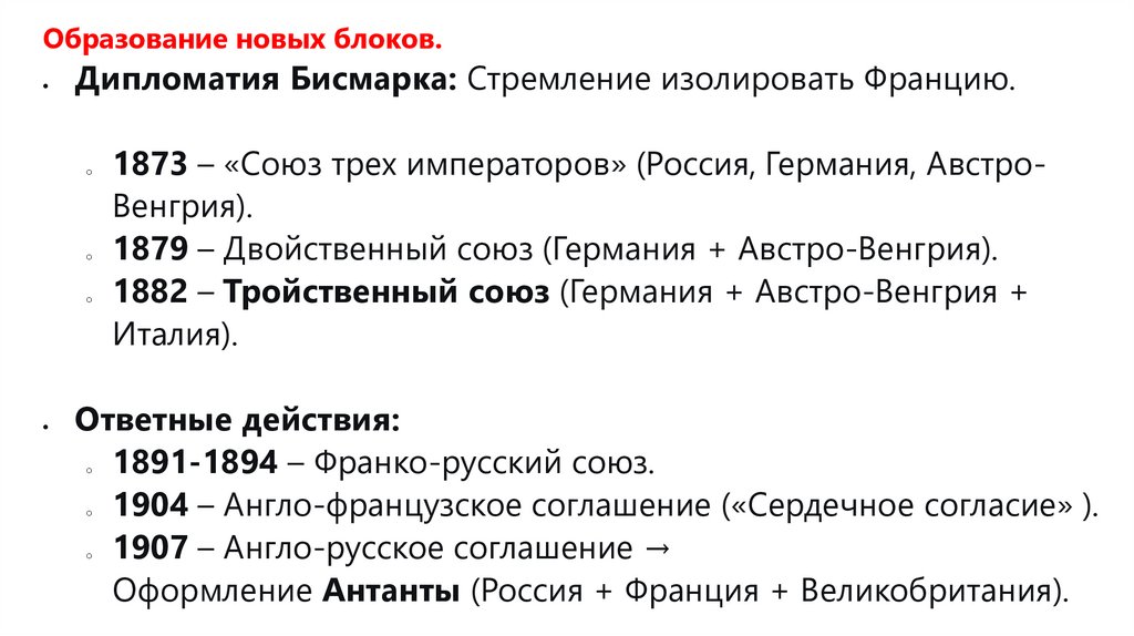 Образование новых блоков.Дипломатия Бисмарка: Стремление изолировать Францию.