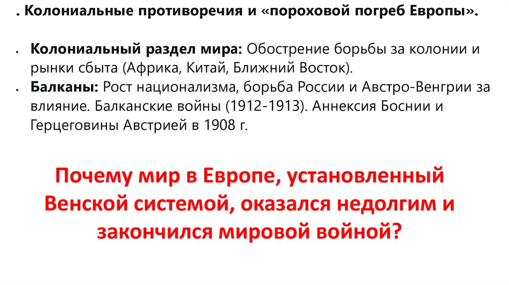 . Колониальные противоречия и «пороховой погреб Европы».Колониальный раздел мира: Обострение борьбы за колонии и
