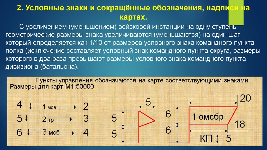 полка (исключение составляет условный знак командного пункта округа, размеры