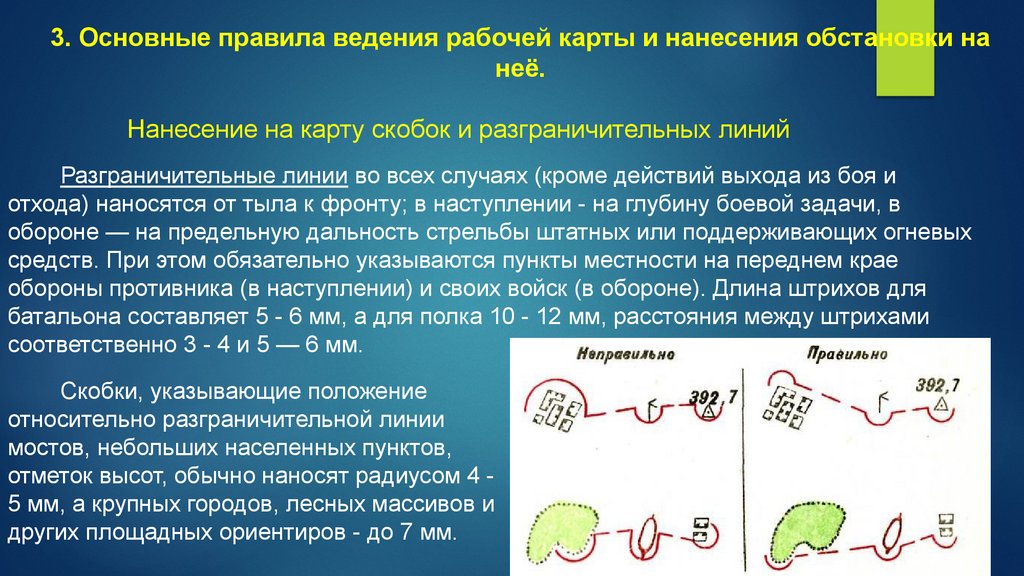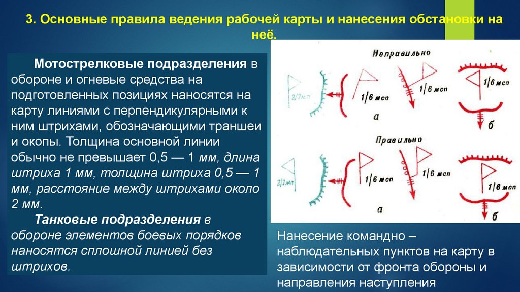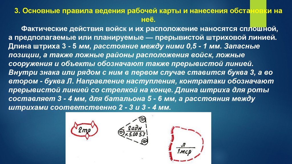 обороны противника (в наступлении) и своих войск (в обороне). Длина штрихов для