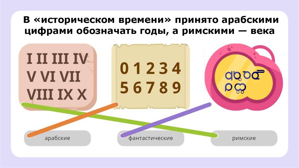 В «историческом времени» принято арабскимицифрами обозначать годы, а римскими — века