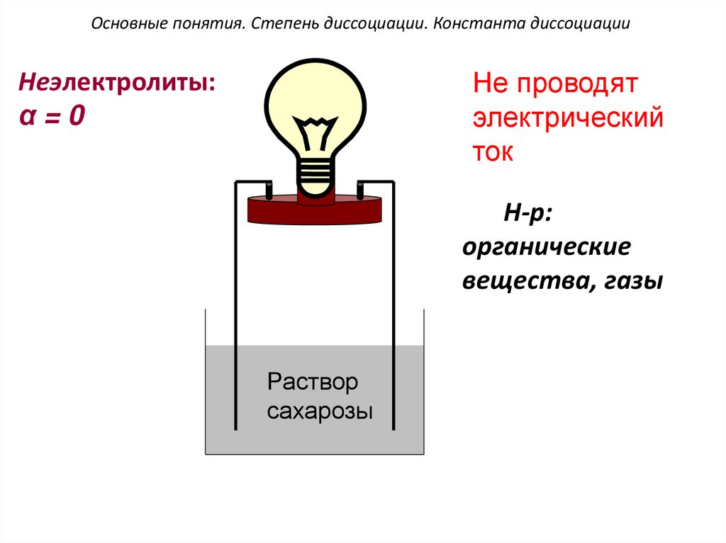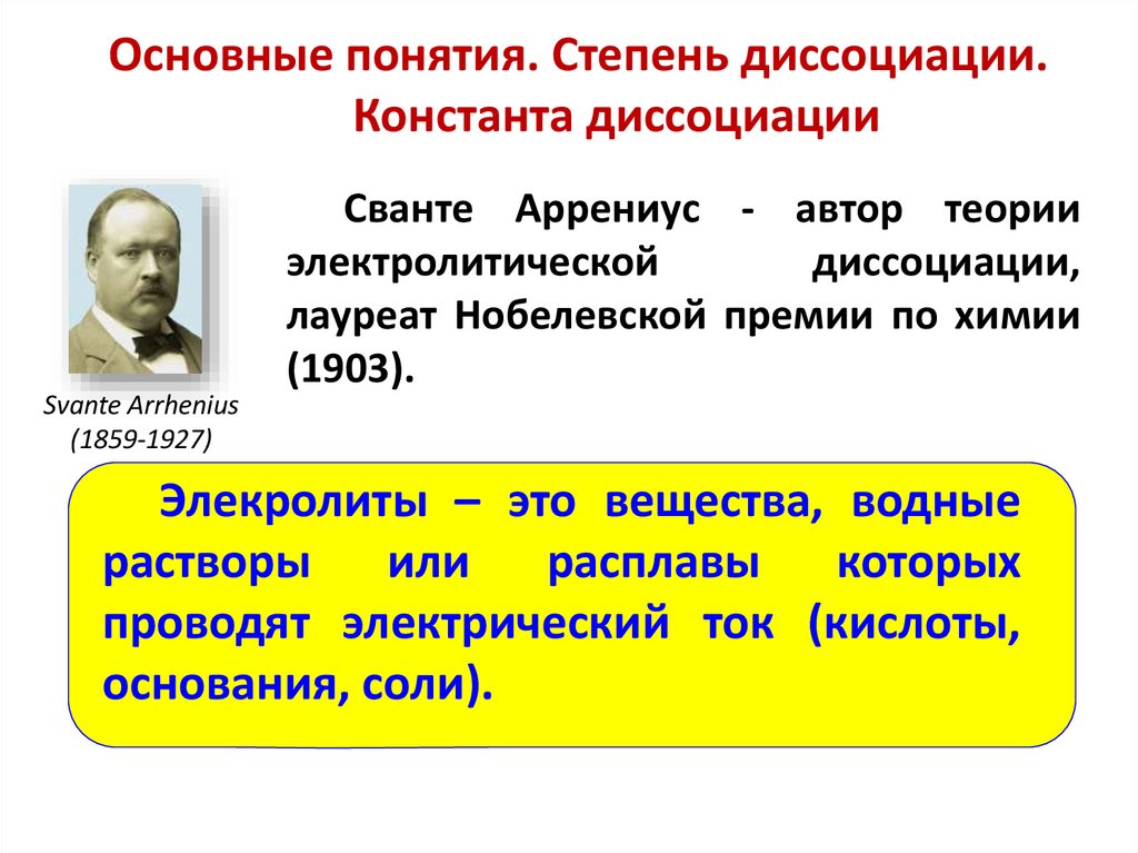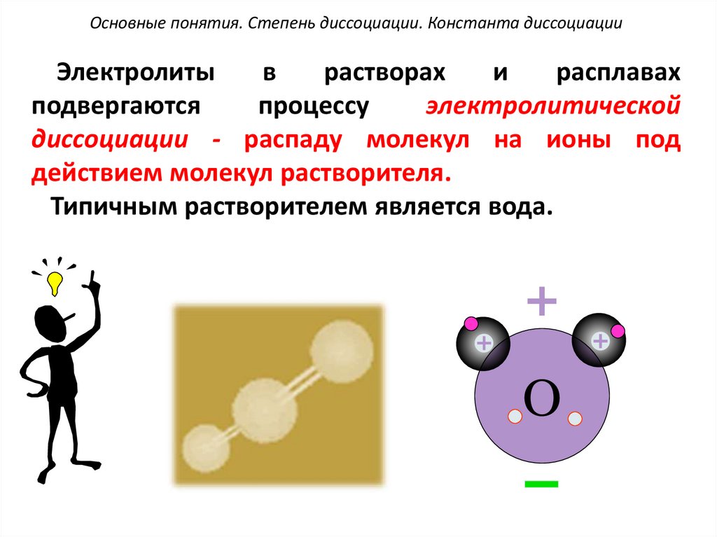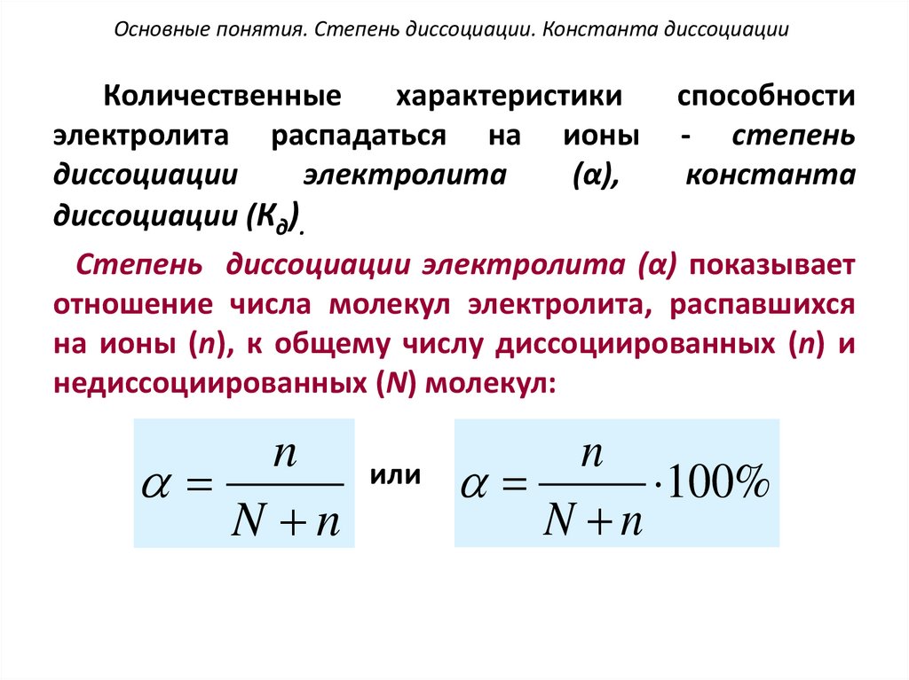 Основные понятия. Степень диссоциации. Константа диссоциацииЭлектролиты