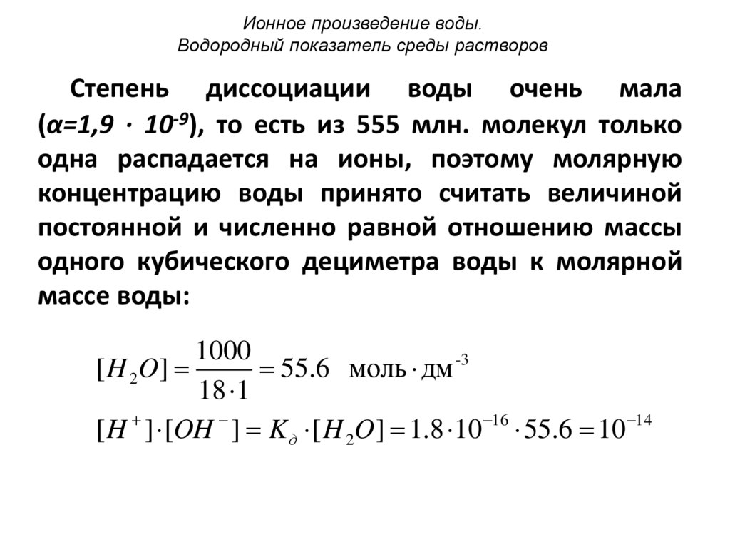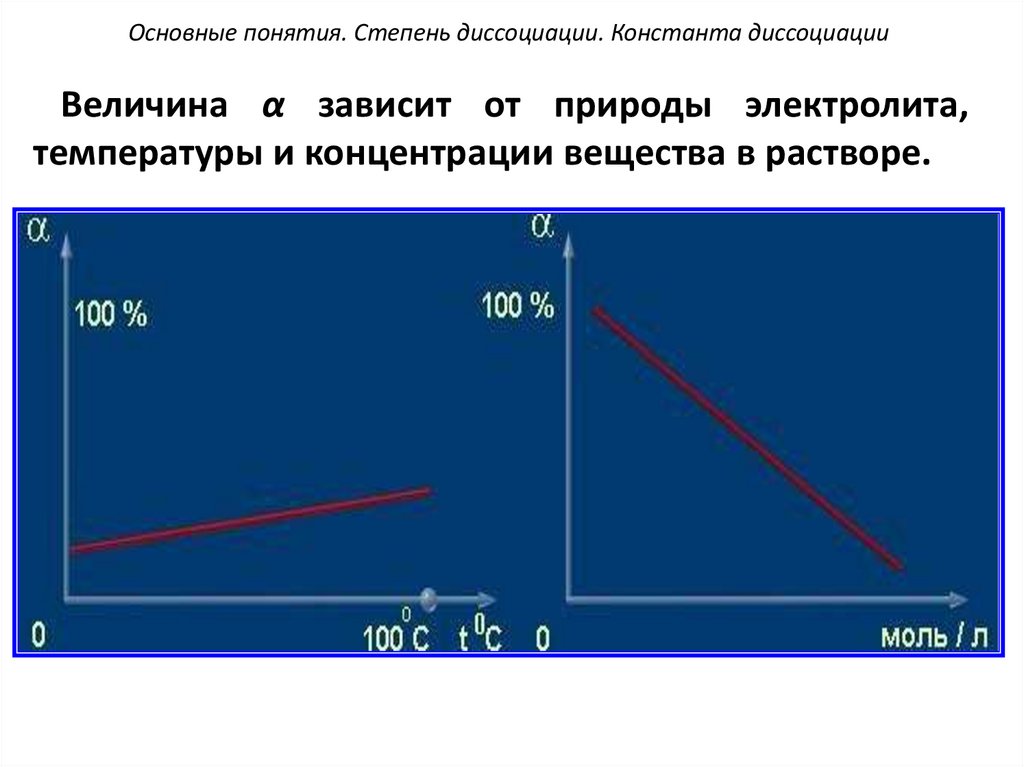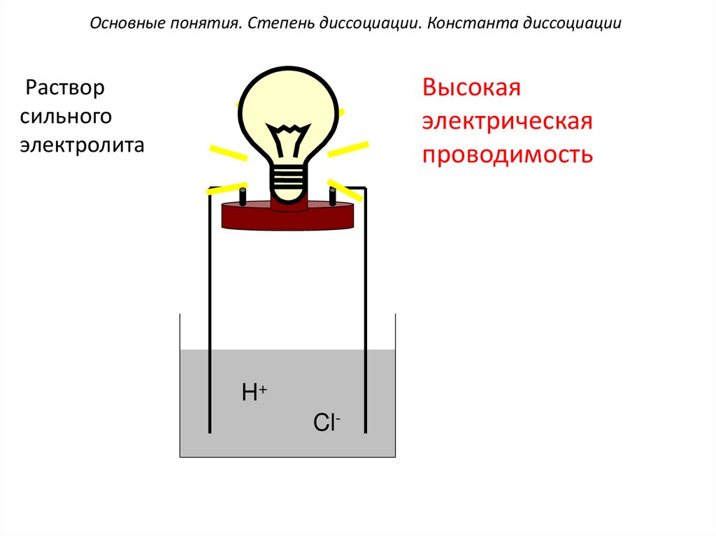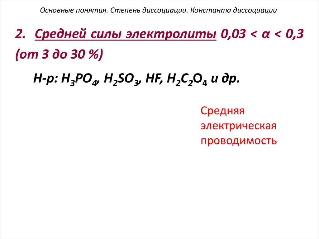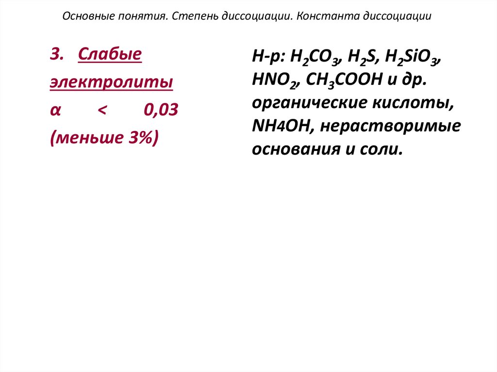 Основные понятия. Степень диссоциации. Константа диссоциацииПо величине α электролиты классифицируют на три