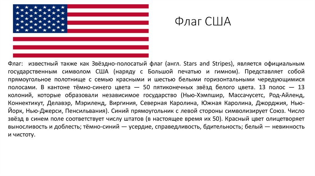 Флаг: известный также как Звёздно-полосатый флаг (англ. Stars and Stripes), является официальнымгосударственным символом США (наряду с Большой печатью и гимном). Представляет собой