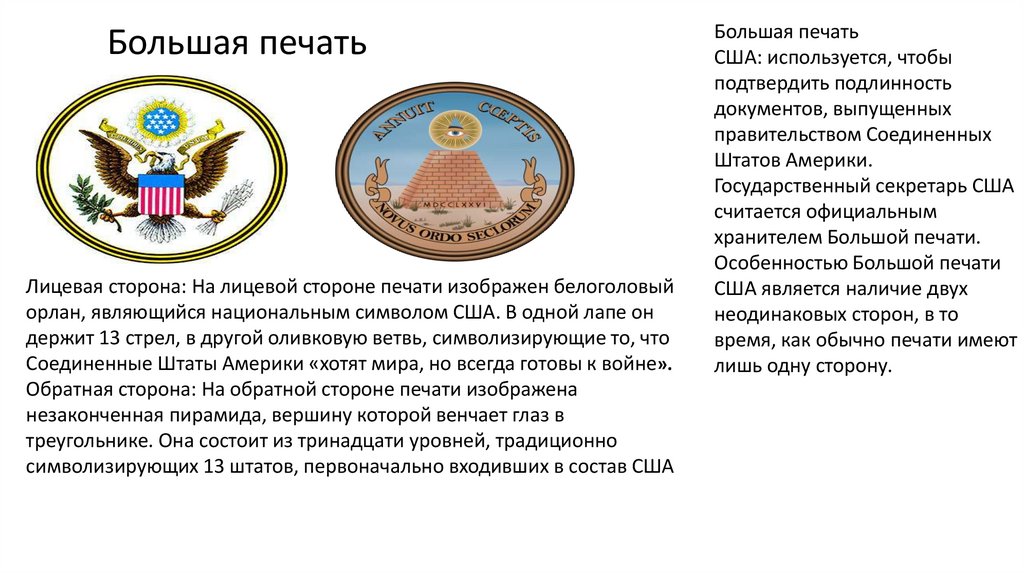 Большая печатьЛицевая сторона: На лицевой стороне печати изображен белоголовый