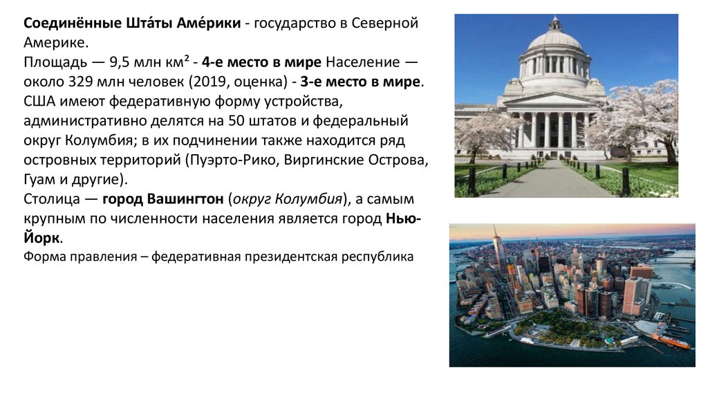 Столица — город Вашингтон (округ Колумбия), а самым