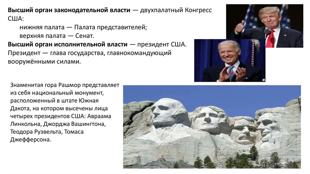 Высший орган исполнительной власти — президент США.